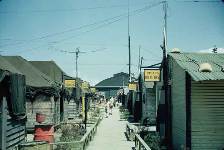 The first tent on the left was my home for the next 18 months. They were replaced by steel barracks buildings which housed more troops and were more resistant to typhoons. Occasionally a tent would just go with the "blow". I don't remember how many troops were in my tent, but there was room for twelve.